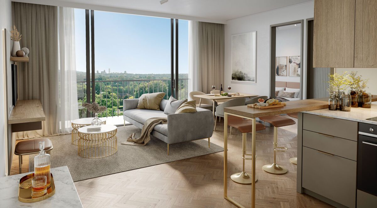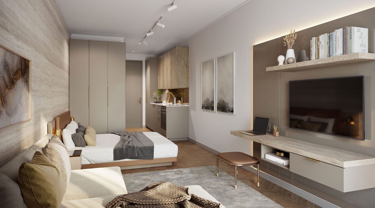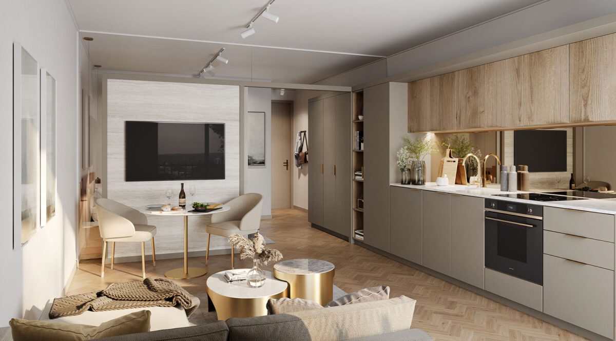 Executive suite, one-bedroom and two-bedroom apartments are on offer, expertly finished with a sophisticated palette featuring tiles or herringbone flooring, stone tops, Smeg appliances and Hansgrohe sanitaryware.