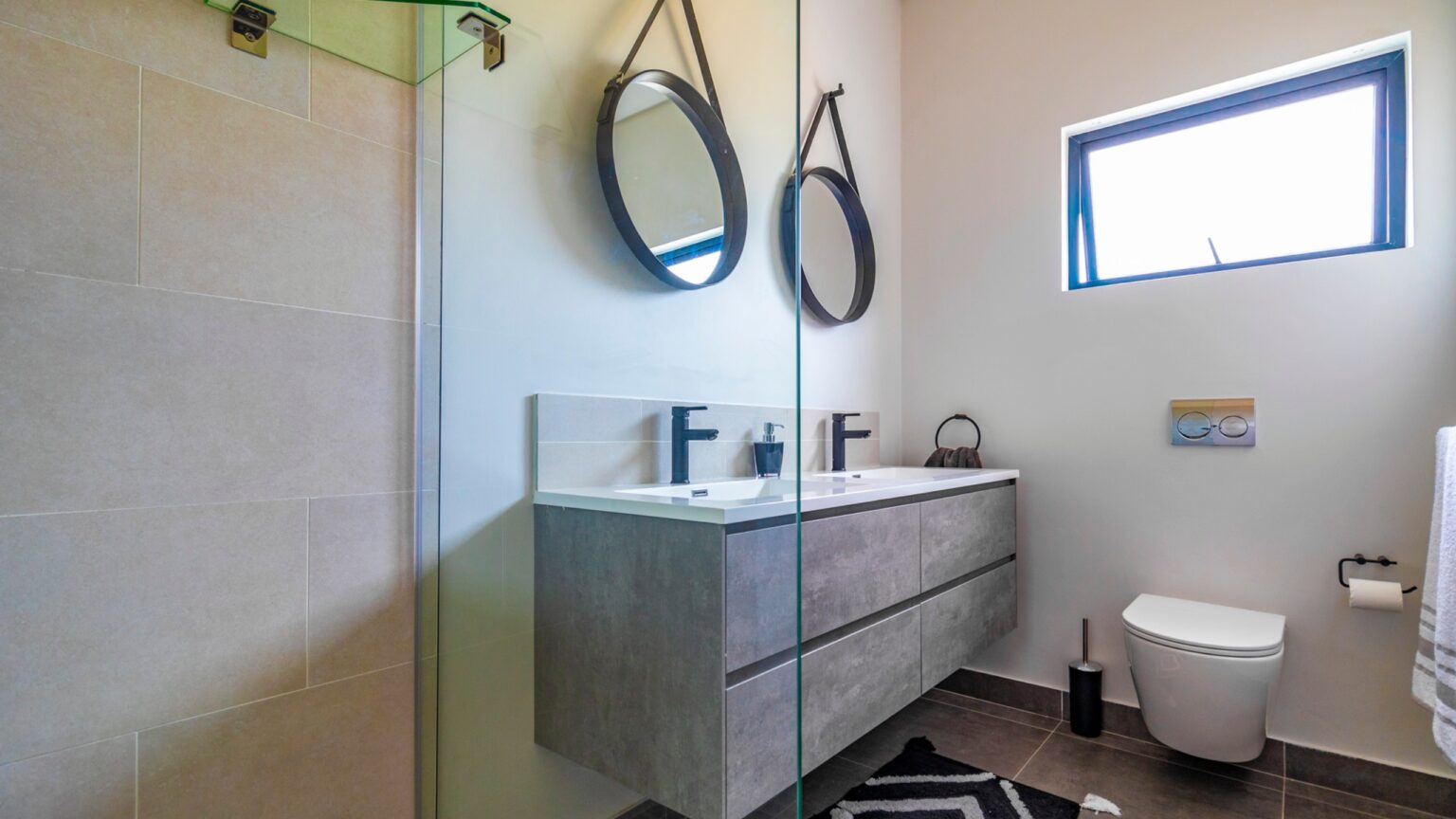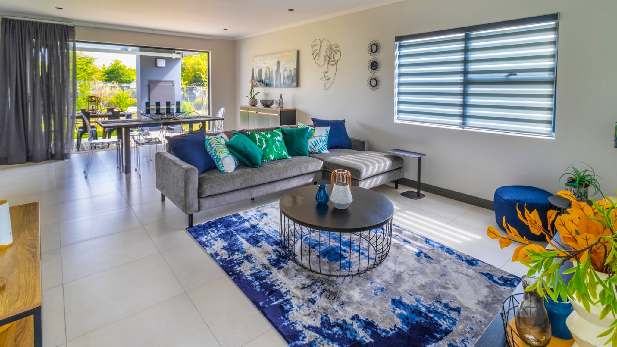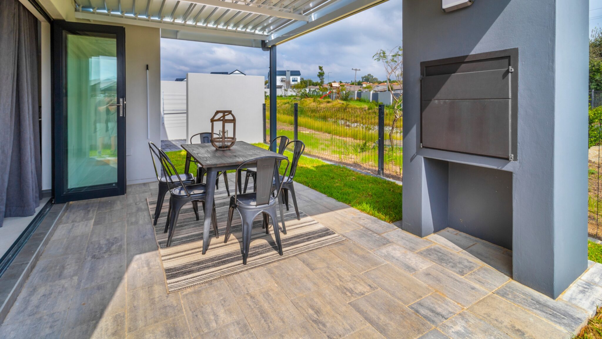 The Weaver Creek home is characterised by open-planned living, allowing a natural flow from the generous living space into the dining area, and luxuriously appointed kitchen with integrated SMEG appliances. A large centre island commands the area providing additional seating and preparation space – ideal for the entertainer. The living areas transition seamlessly, by way of stackable doors, to the covered patio area with built-in braai overlooking the fully contained and private, pet-friendly garden.